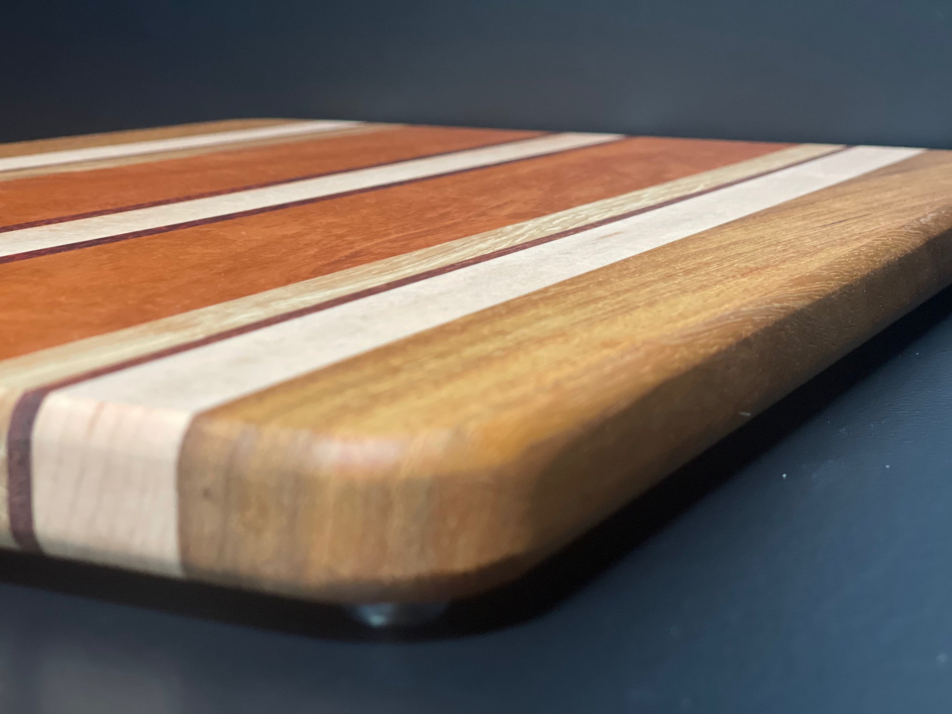 Przenieś codzienne przygotowywanie posiłków na wyższy poziom dzięki tej unikatowej desce do krojenia, wykonanej z połączenia siedmiu gatunków drewna: iroko, paduku, badi, dębu, mahoniu, sapeli i buka. Do produkcji użyto kleju Titebond III, posiadającego certyfikat do kontaktu z żywnością, a powierzchnia deski została zabezpieczona mieszanką oleju mineralnego, wosku pszczelego i soku carnauba. Każdy kawałek drewna tworzy efektowny, naturalny wzór, który sprawia, że deska jest zarówno praktyczna, jak i dekoracyjna. Solidna i trwała – idealna do krojenia warzyw, mięs i pieczywa.