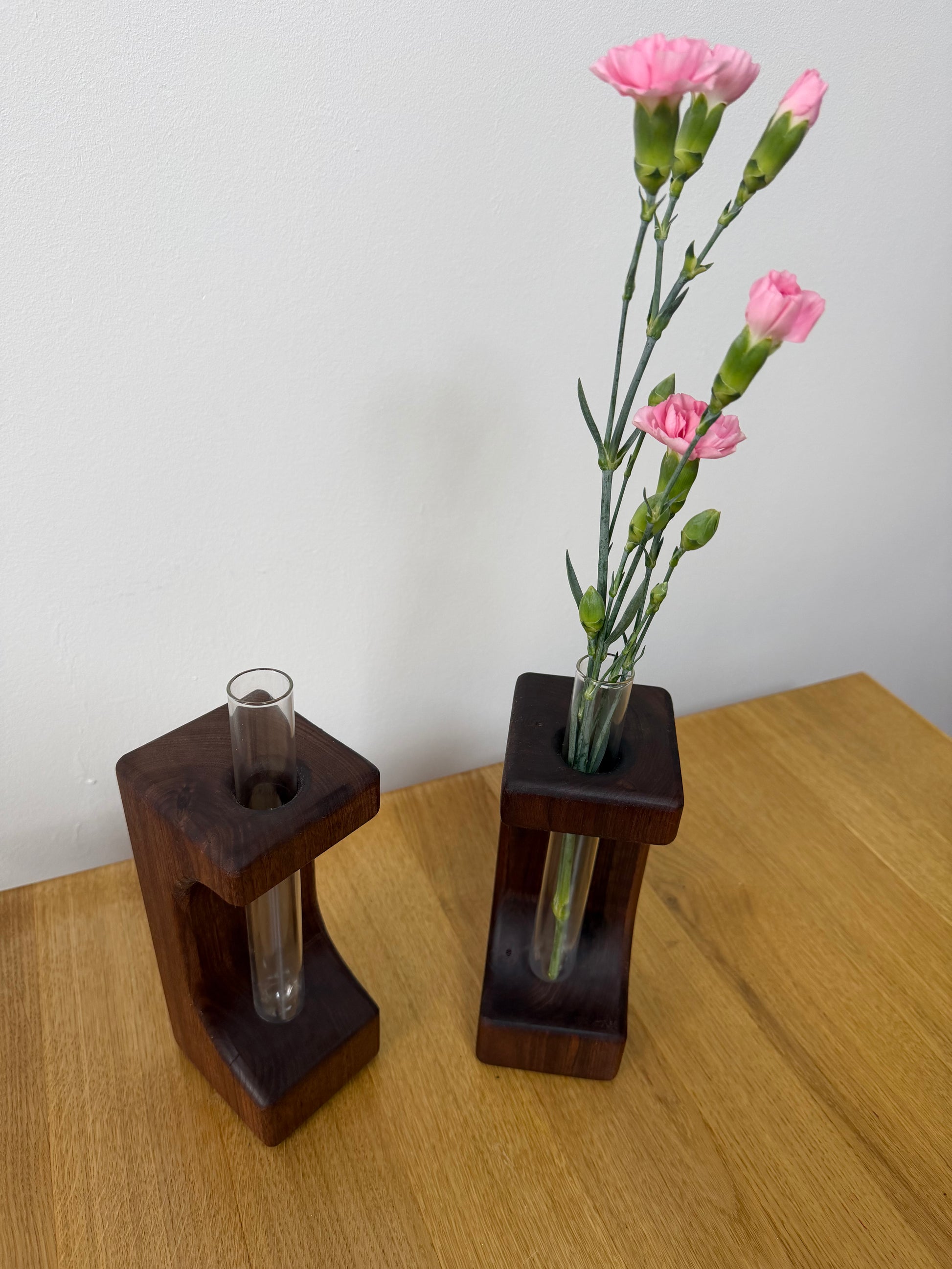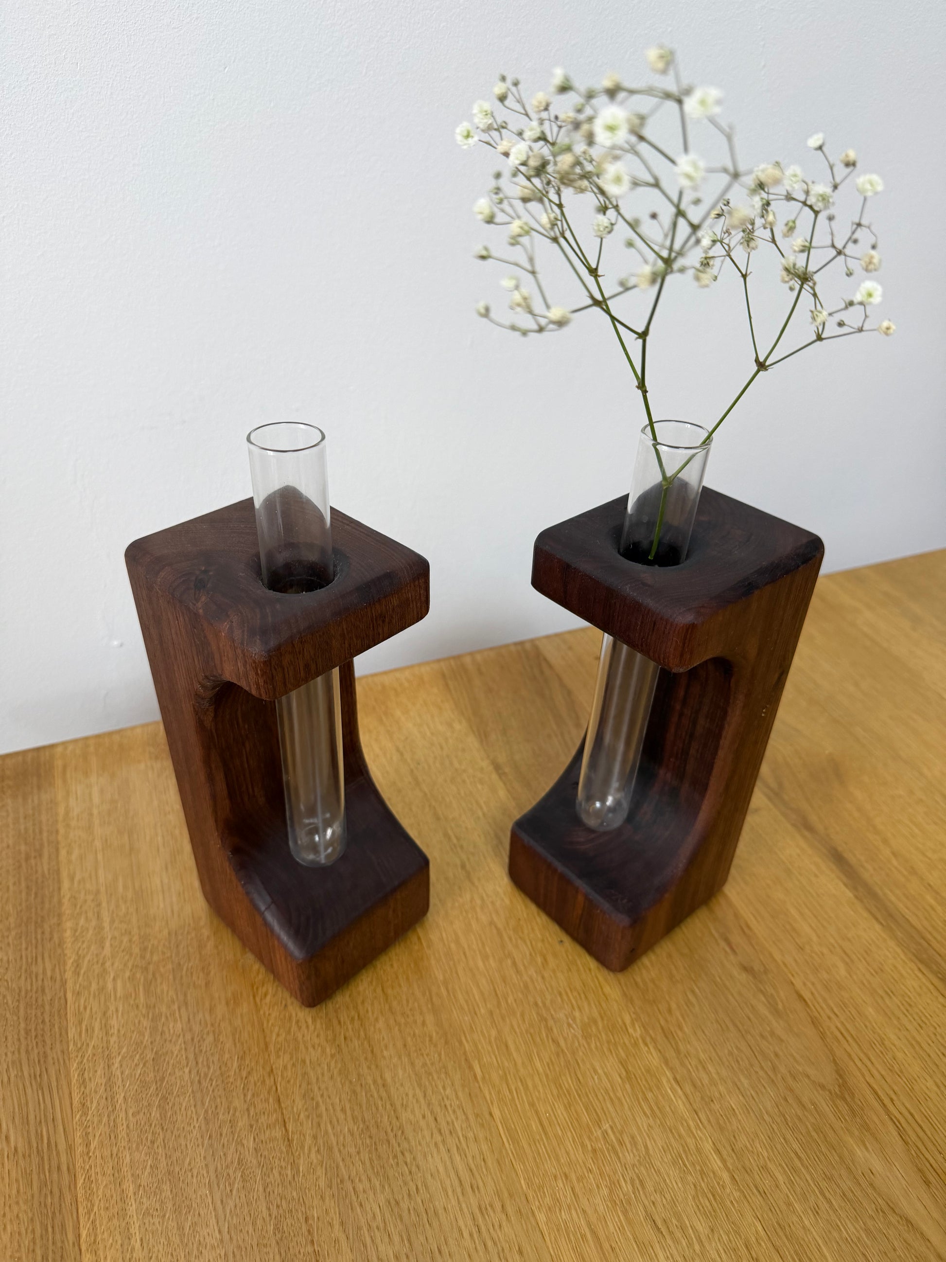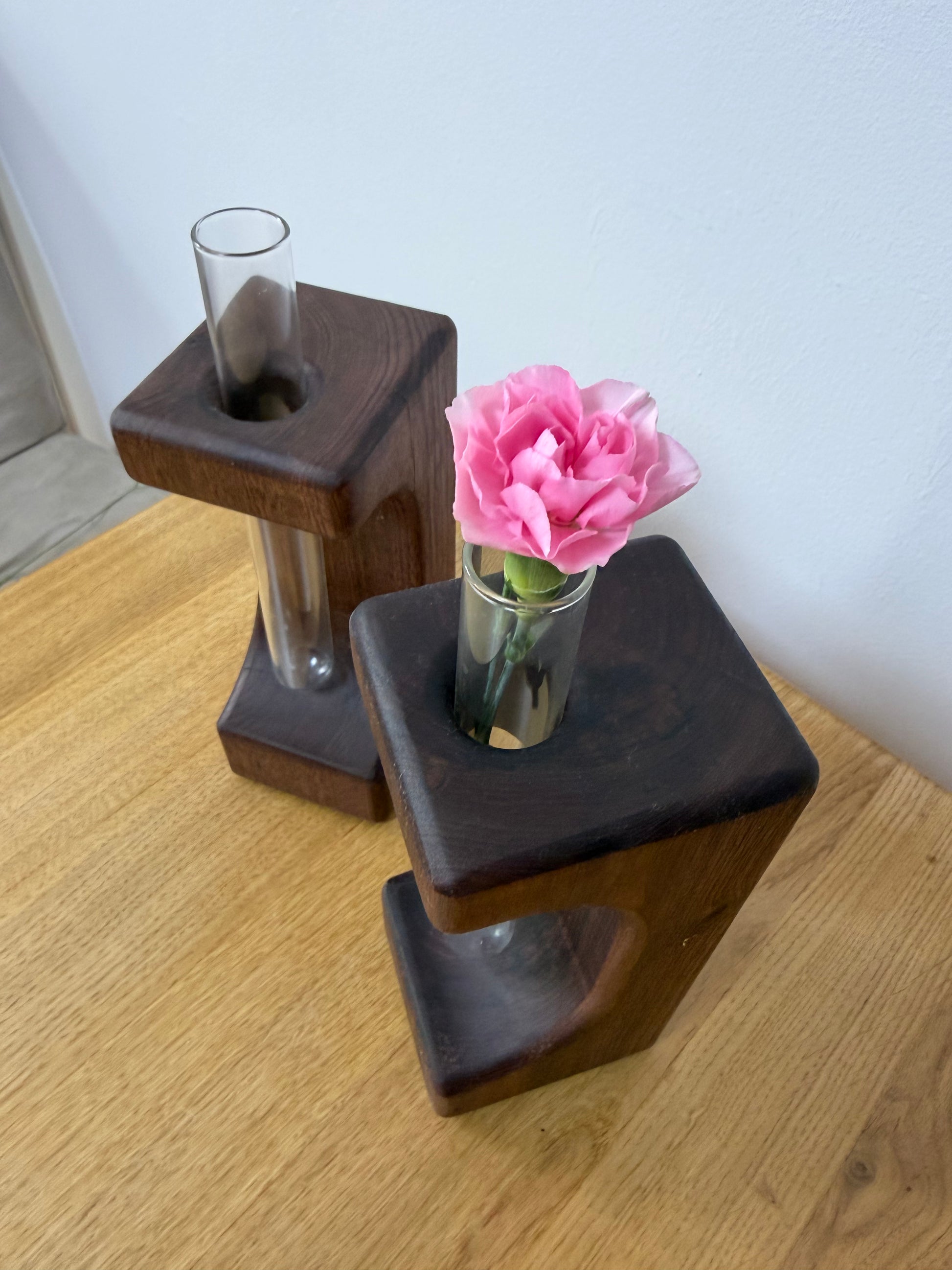 Minimalistyczny wazonik wykonany z jednego kawałka litego orzecha amerykańskiego. Naturalne drewno, szkło i ponadczasowa forma — każdy egzemplarz jest unikatowy.
