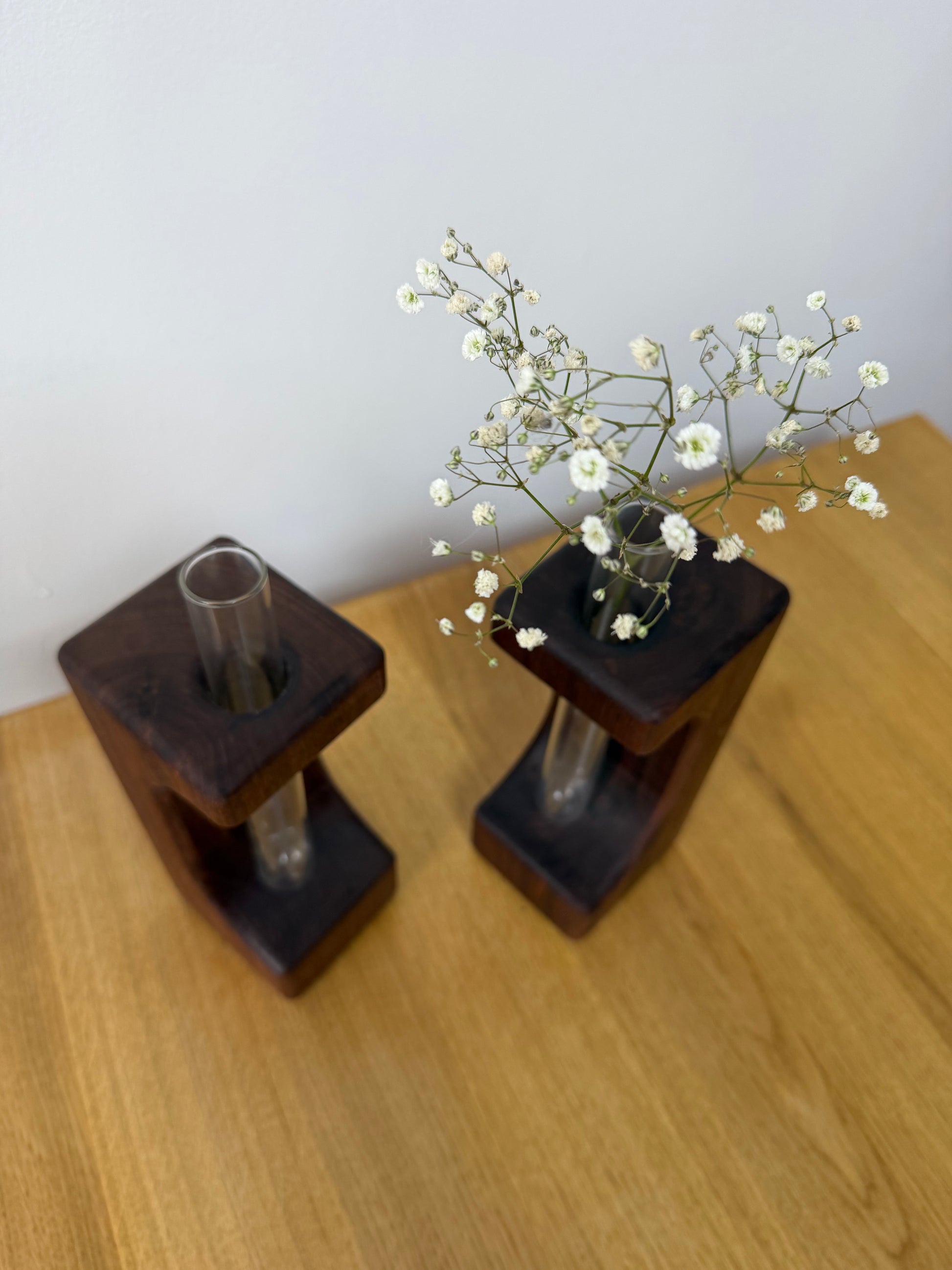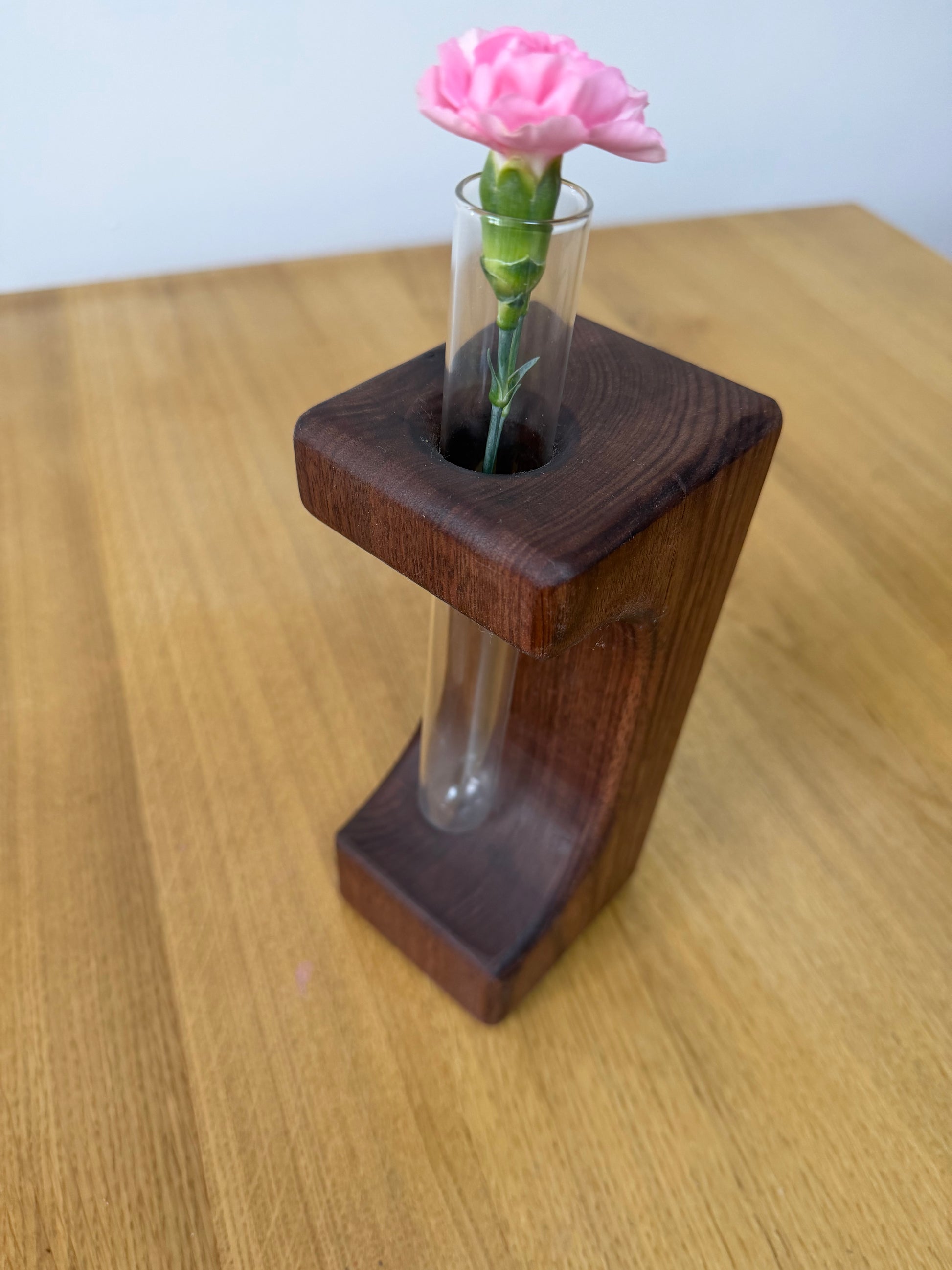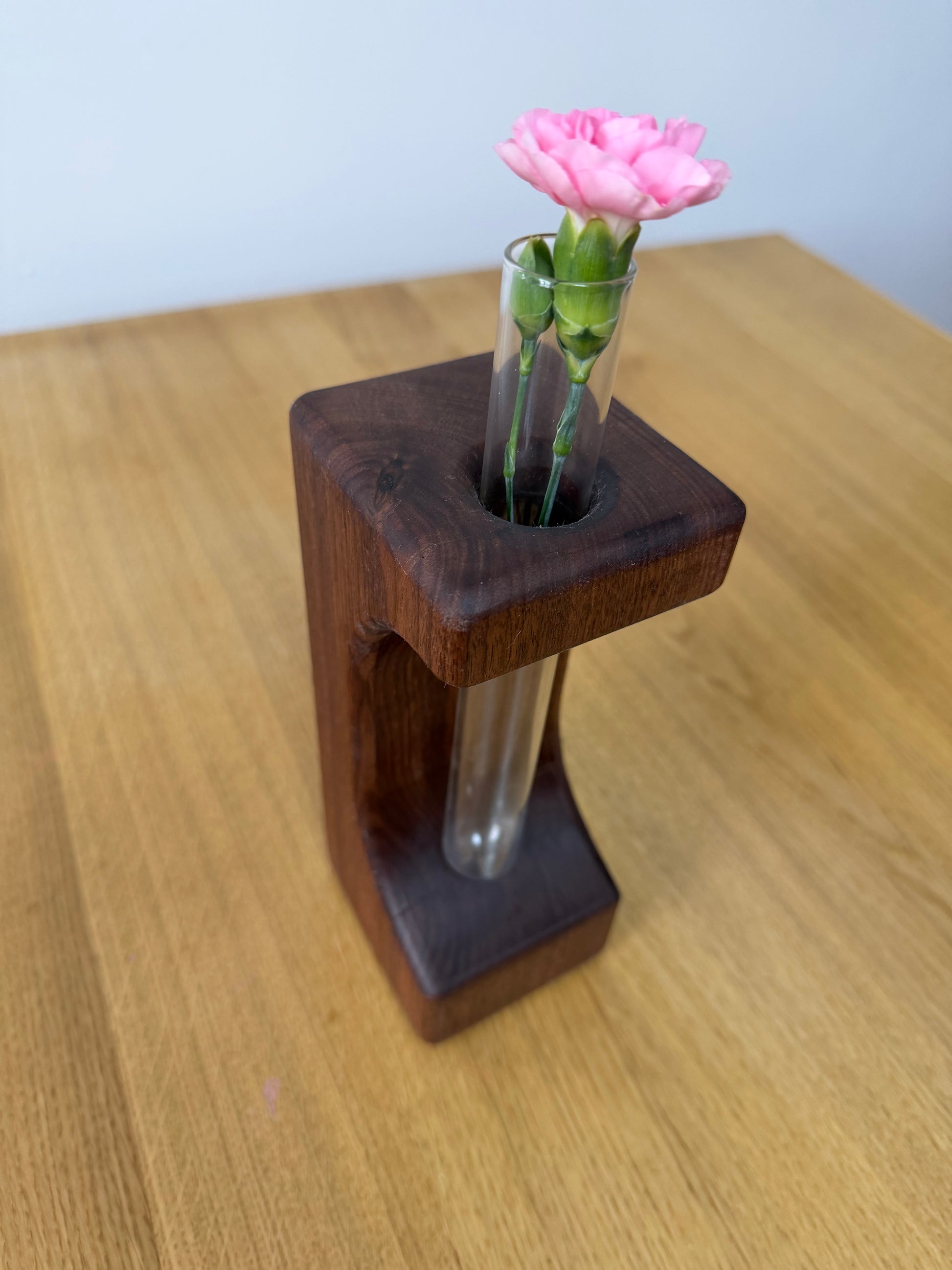 Minimalistyczny wazonik wykonany z jednego kawałka litego orzecha amerykańskiego. Naturalne drewno, szkło i ponadczasowa forma — każdy egzemplarz jest unikatowy.